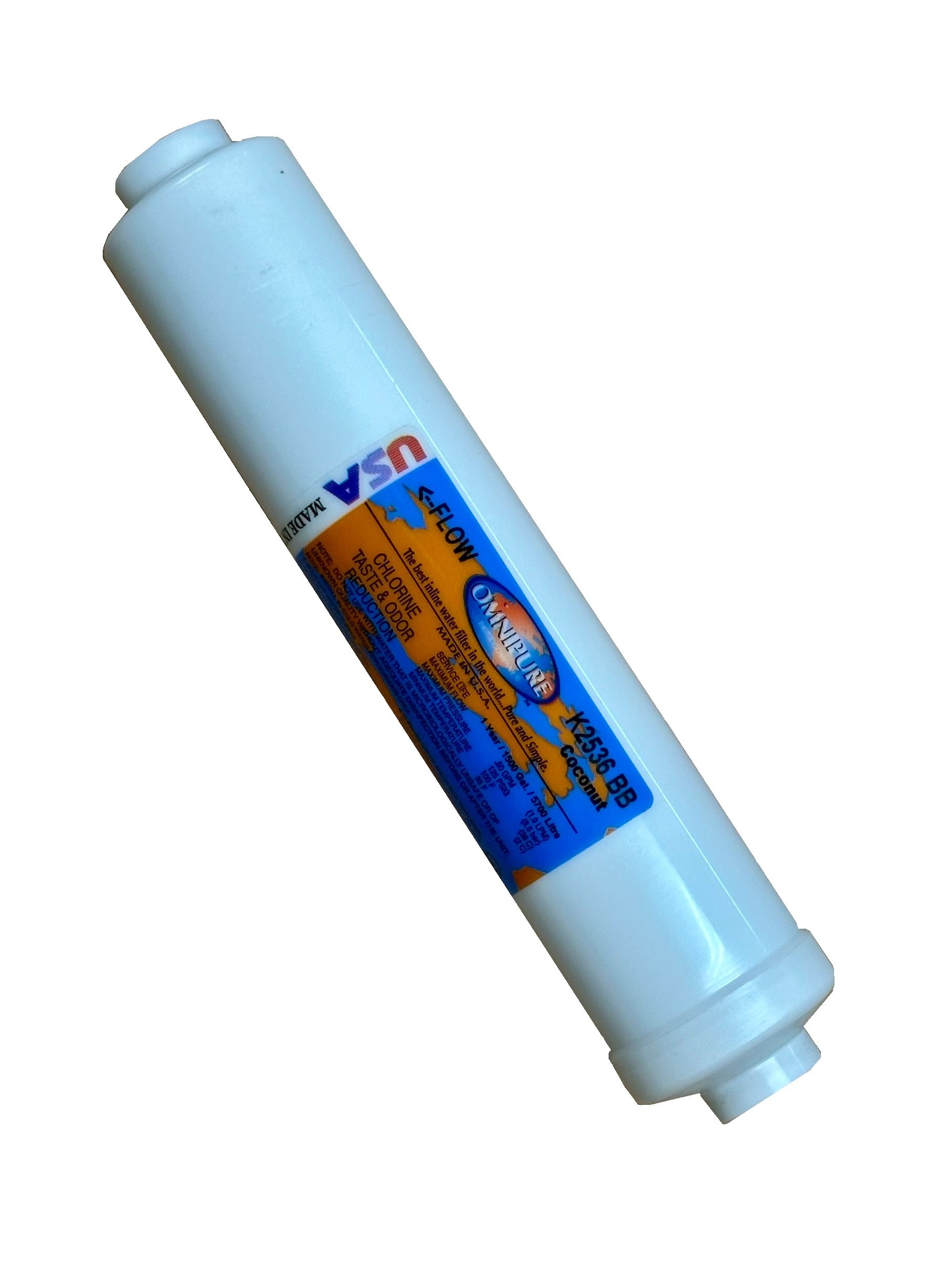 Omnipure Inline Wasserfilter, gefüllt mit aus der Kokosnussschale gewonnenen Aktivkohle.